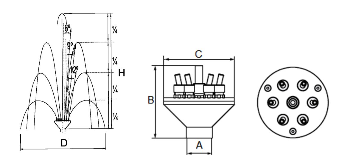 Насадки серии Crown Special комбинируют разные углы наклона выходных отверстий, в результате создаются параболические струи различной высоты. Угол отклонения каждой струи можно регулировать с помощью встроенных шаровых соединений. Эта модель оснащена распределителем потока. Благодаря этому формируется водная картина по форме напоминающая корону. При этом используется единственная подводящая труба. Опционально можно заказать хромирование деталей насадки.